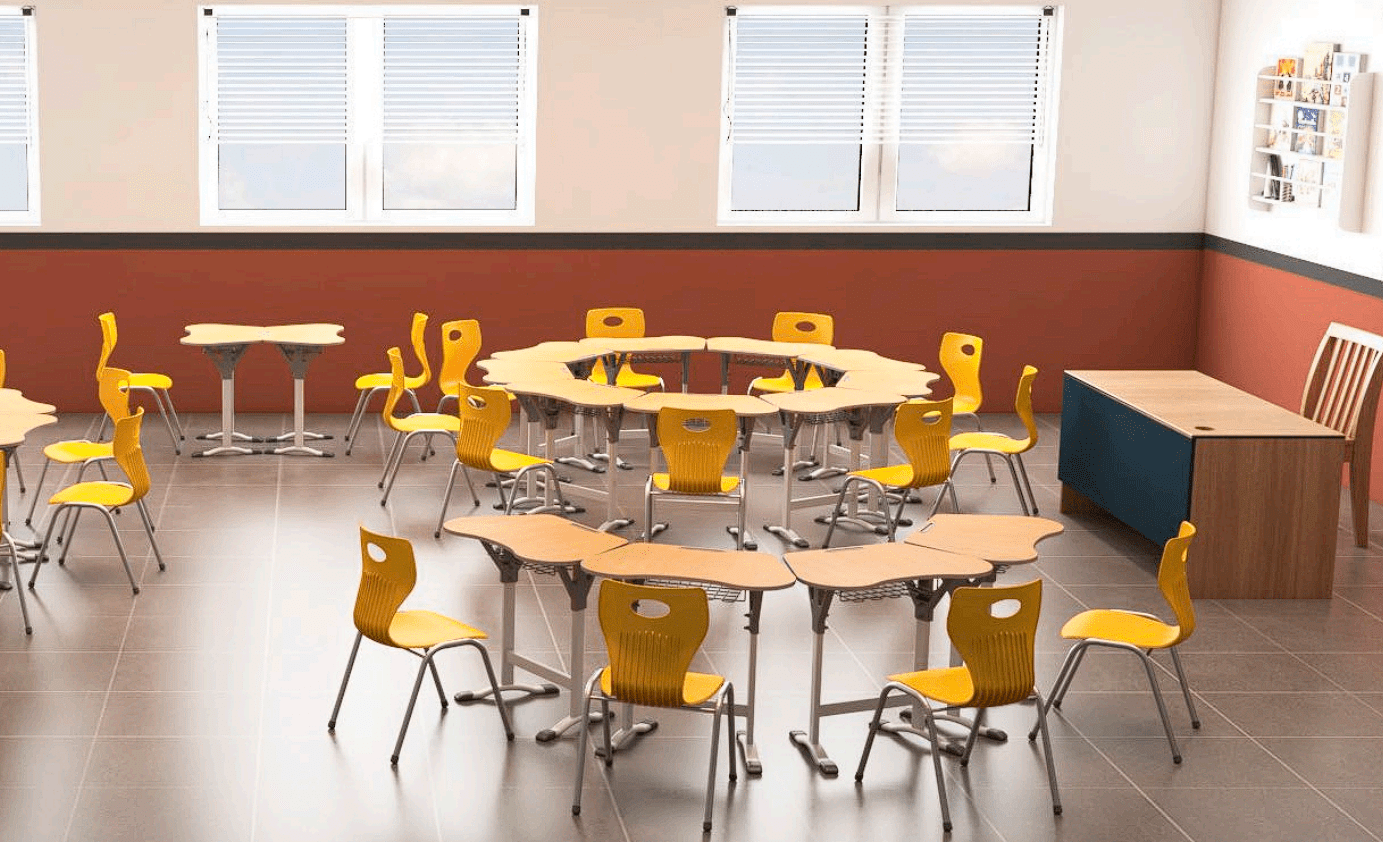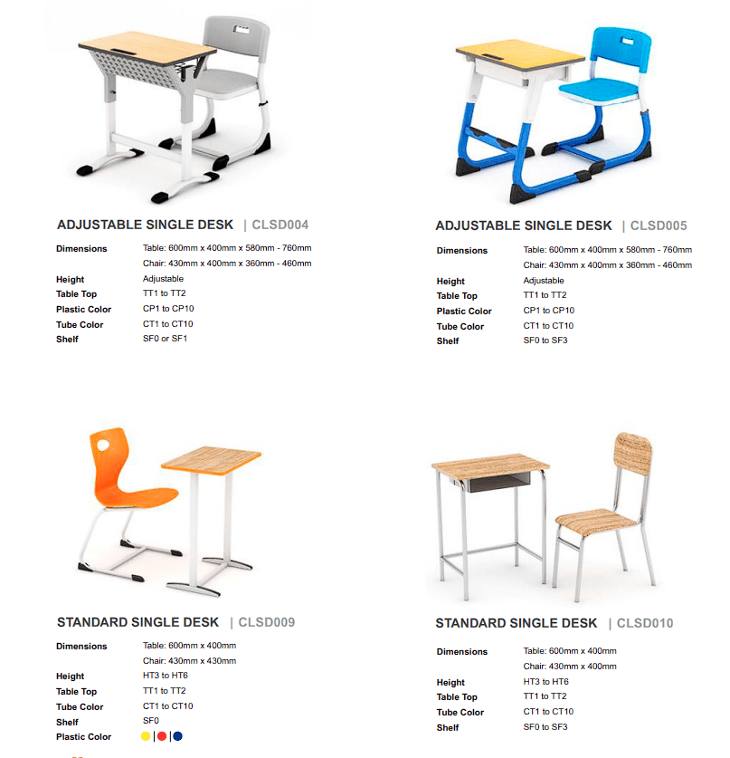 Our diverse selection of furniture includes pieces for various educational settings, such as: Classroom furniture, Seating, Exam and training desks, Kids’ desks, Library desks, Canteen and laboratory desks, Cabinets, Auditorium and soft seating.